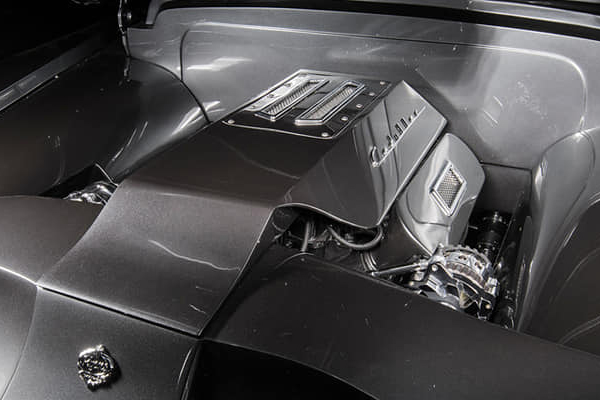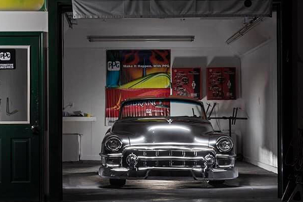 The car is called “Heavy Metal” and in a one year build they nosed, decked and shaved the Caddy, then dropped in a 500 horse LS7 for good measure.The front bumper alone takes 4 guys and a crane to hang! Chris wanted to venture out of the box on the paint color and picked PPG “Punaluu Stone”, a gray color unlike any he has ever used.